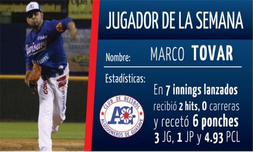 Siguió el dominio desde la loma, tanto así que ahora se pudo premiar a la excelencia monticular. Decisión apretada, no unánime, pero no exenta de hacer justicia al destello individual: Marco Tovar se lució ante la fuerte ofensiva que enfrentó, colgó ceros y así es reconocido como el Jugador de la Semana en la Liga Mexicana del Pacífico durante el lapso comprendido del 19 al 24 de Noviembre.