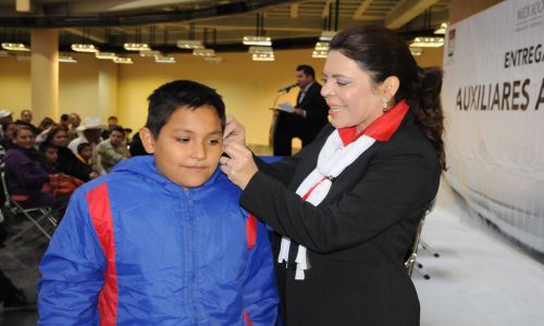 La titular del DIF Municipal, Silvia Félix de López Caballero, encabezó la entrega de estos aparatos en el Anfiteatro del Centro de Gobierno donde se dieron cita cientos de pequeños y jóvenes que, previa valoración, fueron calificados como aptos para recibir este gran apoyo.