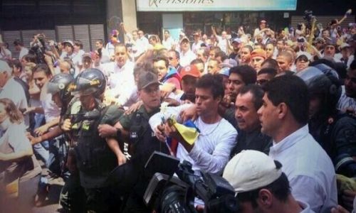 Caracas.- El dirigente opositor venezolano Leopoldo López se entregó en Chacaíto este martes a elementos de la Guardia Nacional, que lo introdujeron en un vehículo ante el rechazo de sus seguidores, que gritaron consignas de apoyo en el momento del arresto.