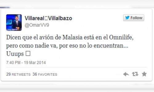 “Dicen que el avión de Malasia está en el Omnilife, pero como nadie va, por eso no lo encuentran… Uuups (sic)”, escribió Villareal Villalbazo en su perfil @OmarVV9.