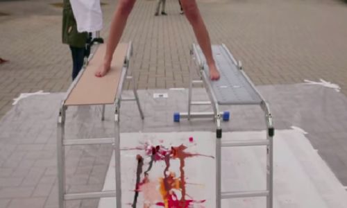 Ahí, frente a todo tipo de peatones, la artista sube sobre un par de escaleras metálicas para quedar en una posición ideal, luego con toda su fuerza femenina, expulsa pequeñas cápsulas plásticas de pintura acrílica que previamente ha metido en su vagina.