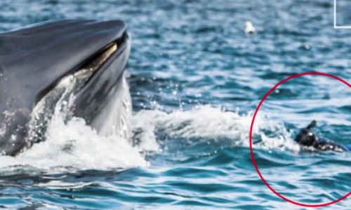 Inesperadamente, la ballena apareció desde el fondo del mar con las mandíbulas abiertas, su intención era atrapar el mayor número de sardinas posibles, sin embargo no se percató que un humano andaba cerca.