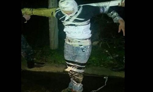 La imagen es sobrecogedora, ya que la víctima luce amarrada a la improvisada cruz, y tiene la cara cubierta con cinta de embalar transparente; le dieron "ejemplar castigo".