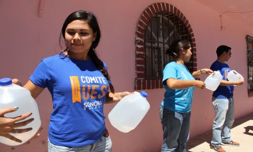 En la entrega del agua participaron los alumnos del Comité UES: Natalie Barreras, Yazaira Barceló, Estefanía Encinas, David Galeana, Aline Molina, Natalia Quintero y Gemma Yanez.
