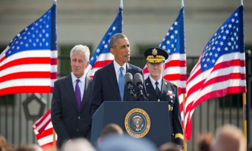 “Seguimos adelante, porque como estadunidenses no cedemos ante el temor”, dijo Obama en tono sombrío tras guardar un minuto de silencio ante familiares de las víctimas en un acto celebrado alrededor de los muros del edificio del Pentágono, golpeado por uno de los aviones secuestrados.