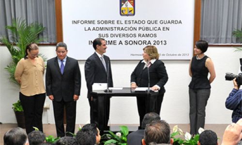 Y por su parte el gobernador Guillermo Padrés Elías les manifestó a los diputados presentes y al resto de los sonorenses que la elaboración de este V informe representa las esperanzas que tienen los ciudadanos en sus autoridades y por eso es que en este documento se puso todo el empeño que han tenido los funcionarios que están al servicio de los ciudadanos con el único fin de tener un estado prospero en todos los sentido.