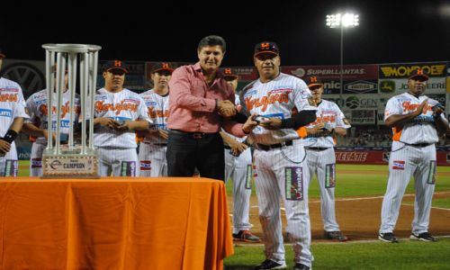 Hermosillo, Sonora. 27 de Octubre del 2014.- Durante el tercer juego de la serie entre Naranjeros de Hermosillo y Mayos de Navojoa, el Lic. Omar Canizales Soto, Presidente de la Liga Mexicana del Pacífico, encabezó una emotiva ceremonia en la que se entregó a 16 jugadores de Naranjeros de Hermosillo el anillo de Campeonato de Serie del Caribe.