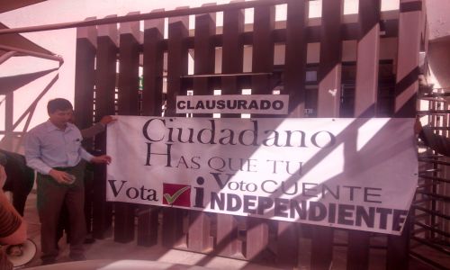 Francisco Salcido integrante del llamado Comité de Candidaturas independientes acudió en compañía de otros de sus compañeros hasta las instalaciones del instituto estatal electoral para colocar unos sellos de clausura y unas lonas donde solicitan que las personas voten por las y los candidatos independientes y puedan ser un referente en este caso del congreso local, pero para eso urgía en primer lugar que se reforzarán las acciones de difusión.
