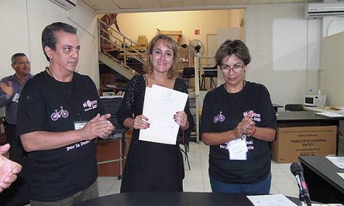 La consejera presidenta del INE en Guaymas, Martha Angélica Olvera Coronilla acompañada del secretario del Consejo, Víctor Martín Trejo Galaz, hizo entrega de la constancia de mayoría y validez a la vez que felicitó a la ahora Diputada Federal Electa.