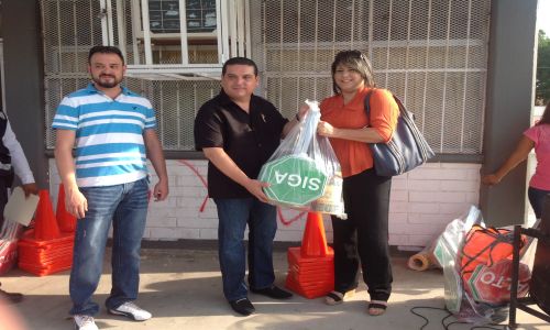 Hermosillo, Sonora, 22 de junio de 2015.- Representantes de seis escuelas de educación básica de Hermosillo, recibieron esta mañana el equipo necesario para el señalamiento y la aplicación de escuadrones viales que protejan a los pequeños estudiantes.