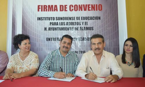 Álamos, Sonora. 25 de febrero de 2016.- Para reforzar los trabajos educativos del Instituto Sonorense de Educación para los Adultos (ISEA) y promover actividades a favor de la comunidad con carencias escolares, se firmó un convenio de colaboración con el Ayuntamiento de Álamos.