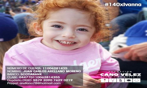 Para mayores informes los interesados en poder sumarse de la forma que sea a esta noble causa de la pequeña Ivanna que será intervenida quirúrgicamente el próximo 14 de abril, pueden hacerlo a través de #140XIvanna o ingresando a la página www.canovelez.com/140xIvanna, con depósitos bancarios a la cuenta 11006281435 de Scotiabank, a nombre de Juan Carlos Arellano Moreno, Clabe para transferencia: 044770110062814355; Depósito OXXO: 5579 2090 7629 0219 o directamente a PayPal: arellano78@hotmail.com.