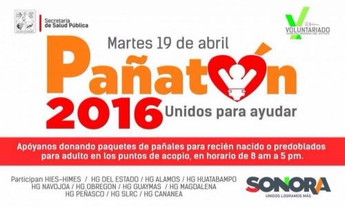 Hermosillo, Sonora, abril 13 de 2016.- Con el fin de recolectar la mayor cantidad de pañales posible, el Voluntariado de la Secretaría de Salud realizará el “Pañatón 2016”, el próximo 19 de abril.