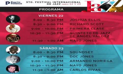 El electo programado, están las magnas presentaciones de Joshua Ellis, el viernes 22 de abril a las 20 horas, posteriormente Richard Scott y a las 21 horas Primera Clase: a las 22:30 horas Quinteto de Jazz de Angel Valdez, a las 23:30 horas Nayo Jones.