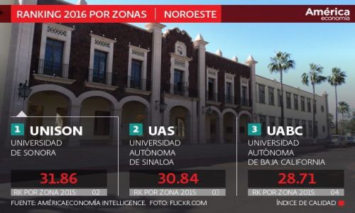 Añadió que en el caso de la Zona Noroeste, la Universidad de Sonora es colocada por encima de instituciones como la Universidad Autónoma de Sinaloa y de Baja California, las cuales, reconoció, también también son universidades de prestigio.