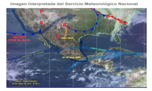 El frente frío  número 60 se localiza en el norte de Baja California y noroeste de Sonora, se asocia con una baja presión de núcleo frío en niveles medios de la atmósfera sobre el suroeste de E.U., lo que favorecerá descenso moderado de temperatura y viento predominante de dirección sur y suroeste con rachas fuertes en el estado, en las regiones norte y oriente se podrían presentar rachas mayores de 60 kilómetros por hora (Km/h).