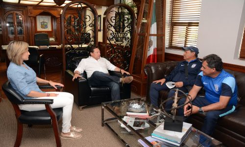 El Presidente Municipal, acompañado de Mirna Judith López Valenzuela, directora del Instituto del Deporte Municipal, sostuvo este martes un encuentro con los profesores Ricardo Ochoa Menchaca y Carlos Sánchez Deita, enviados de los Tuzos para dale seguimiento a jugadores que puedan interesarle al equipo.