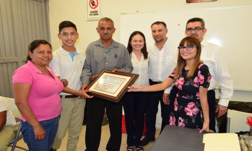 Con la Supervisión del Lic. Samuel Solís y los alumnos Fabián Valencia y Salma Solís, hicieron entrega de un reconocimiento al Joven Mario Javier, por su buena conducta y mejora en el aprovechamiento de la escuela, exhortándolo a seguir adelante con su carrea académica y así mejorar un futuro más saludable, realizaron gestiones para entregar a los demás jóvenes balones de fut Ball, voley ball, basquet ball y redes para las canchas, esto con el propósito para que la escuela promueva el deporte y también reconocer la asistencia de cada uno de ellos, haciendo muestra que el estudio y los resultados de su esfuerzo, siempre serán recompensados para el bien propio.