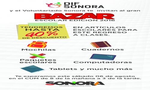 Hermosillo, Sonora, agosto 3 de 2016.- En apoyo a la economía de las familias sonorenses durante este regreso a clases, el Sistema para el Desarrollo Integral de la Familia en el Estado realizará el Bazar Escolar 2016.