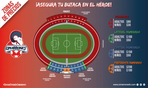 De igual forma, les comunicamos que bajamos los precios en la Zona Poniente para dar a todos los aficionados la oportunidad de asistir al Estadio y apoyar a sus Cimarrones. Ponemos a su disposición el mapa con las diferentes zonas y los precios con los cuales contaremos en el Estadio “Héroe de Nacozari”.