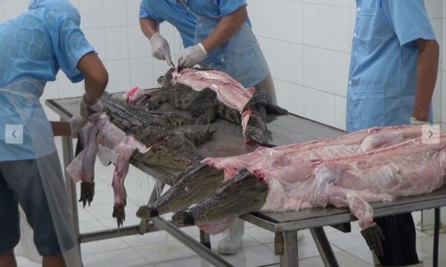 A través de un duro video, la organización mostró situaciones en las que los trabajadores de una de esas instalaciones abren la cabeza de los cocodrilos mientras aún están vivos. Después, los matan al clavarles una vara de metal por el orificio para atravesar el cuerpo a través de la espina dorsal.