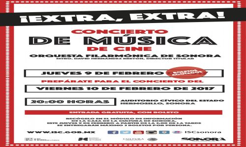 Hermosillo, Sonora, 09 de febrero de 2017.- La Orquesta Filarmónica de Sonora dirigida por el Maestro David Hernández Bretón, abre nueva fecha para su Concierto de Música de cine después de que se agotaran los boletos para su presentación este jueves 9 de febrero.