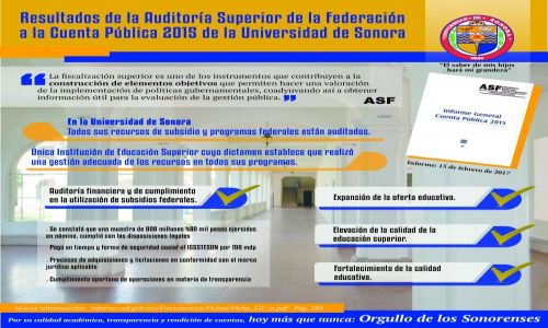 La Universidad de Sonora realizó una gestión adecuada de los recursos que recibe tanto de la Federación como del Estado, motivo por el cual, la alma mater obtuvo cero observaciones en los resultados de la auditoría realizada al 80% del subsidio ordinario que esta casa de estudios recibe para su sostenimiento; fue fiscalizado también el 100% de los recursos de los otros fondos federales, concluyendo la Auditoría Superior de la Federación (ASF) en su dictamen que la máxima casa de estudios de la entidad realizó, en general, una gestión adecuada de los recursos en todos sus programas.