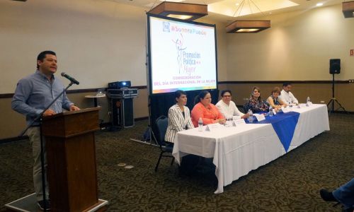 Estuvieron acompañando a los antes mencionados en el presídium, la Secretaria de Promoción Política municipal Elvira Mena, y la expositora de la conferencia “La mirada sobre las mujeres” Fernanda Galindo.