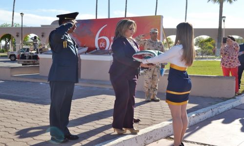 Ante la presencia del cuerpo de regidores y funcionarios municipales y estatales, se realizaron los honores de ordenanza para dar paso a la ceremonia de izamiento de nuestra enseña patria que fue entregada a la presidenta municipal, Karina García, por las integrantes de la escolta de la Universidad de Sonora.