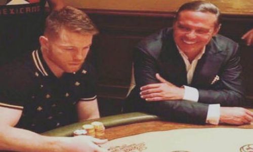 Sentados en la misma mesa, el boxeador luce más serio mientras observa las cartas y Luis Miguel sonríe.