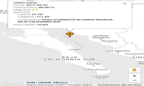El titular de la Unidad Municipal de Protección Civil dijo que el sismo fue de una magnitud de 4.3 localizado a 74 kilómetros al noreste de Santa Rosalía, Baja California.