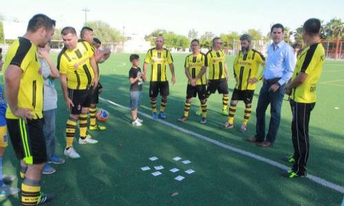 En visita a los campos de futbol de la colonia Café Combate, Epifanio “Pano” Salido felicitó a los integrantes del equipo de la Liga de Futbol de Veteranos Hermosillo que juegan en ese lugar, además de apoyarlos con material deportivo.