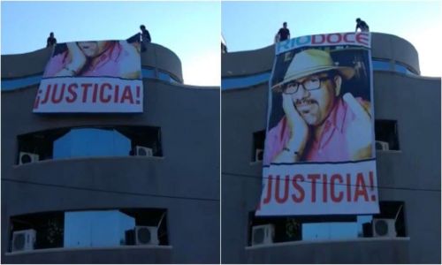Una enorme manta que exige justicia en letras rojas esta en la fachada de Noroeste, donde trabajaba el periodista