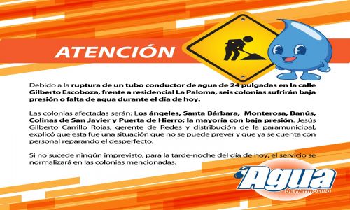 Si no sucede ningún imprevisto, para la tarde-noche del día de hoy, el servicio se normalizará en las colonias mencionadas.