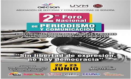Este evento que se desarrollará los días jueves 22 y viernes 23 de junio en coordinación con la UVM, en el auditorio de esta institución ubicada en Blvd. Enrique Mazón #617, colonia Café Combate, donde se contará con la exposición de reconocidos periodistas con importantes coberturas sociales, ambientales, políticas, de seguridad y en campos de guerra, entre otras.