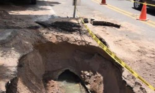 Personal de Agua de Hermosillo repara 230 metros de tubería sanitaria de 24 pulgadas de diámetro, colapsada en el cruce del bulevar Solidaridad y la calle Olivares por el volumen de agua captado durante la lluvia del lunes y al cumplir con su vida útil