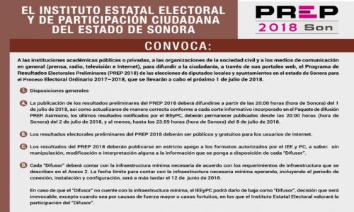 El Instituto Estatal Electoral de Sonora, convoca a instituciones académicas, organismos y medios de comunicación a participar en la difusión a la ciudadanía a través de sus portales de internet, de los Resultados Electorales Preliminares (PREP 2018) con motivo de la Jornada Electoral del próximo 1 de julio.