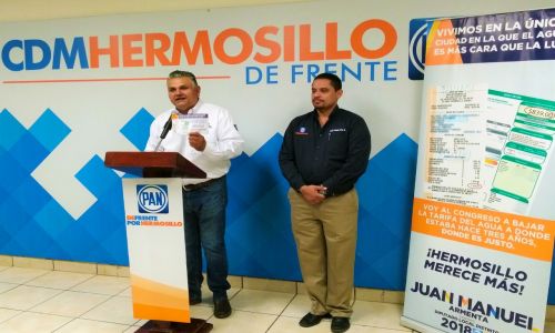 En rueda de prensa acompañado del Presidente del Comité Directivo Municipal, Jesús Ramón Díaz Beltrán, el candidato señaló que existe una indignación y un solo clamor en todo el sector sur de la ciudad, lo cual es un sentir generalizado en Hermosillo, dado que este aumento del 70% al agua implementado por la actual administración municipal priísta, con el aval de sus diputados en el Congreso del Estado, fue un golpe certero a la economía de los hermosillenses, de ahí que nace esta propuesta de darle reversa, en respaldo además a la intención de la candidata a la alcaldía Myrna Rea de bajar la tarifa.