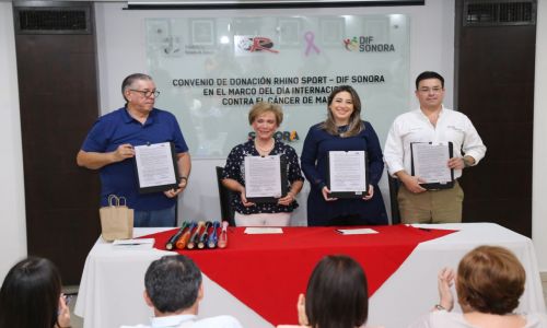 .Hermosillo, Sonora, octubre 11 de 2018.- En apoyo al sano desarrollo y crecimiento de las familias y sectores de la población más vulnerable, directivos del Sistema DIF Sonora y la empresa sonorense Rhino Sport, firmaron un convenio de colaboración para unirse a la lucha contra del cáncer de mama.