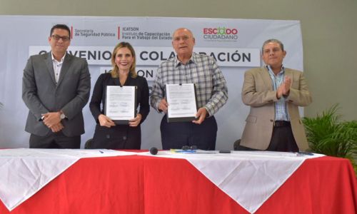 Hermosillo, Sonora; noviembre 2 de 2018. Para reforzar el trabajo de prevención, a través del Programa Escudo Ciudadano, en colonias focalizadas y generar con ello entornos tranquilos, autoridades de la Secretaría de Seguridad Pública (SSP) y del Instituto de Capacitación para el Trabajo del Estado de Sonora (Icatson), firmaron un convenio de colaboración.