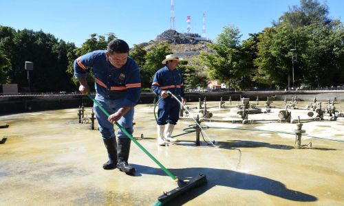 Trabajadores del área de Parques y Jardines trabajan en la limpieza, desazolve y mantenimiento general de la fuente del Parque Madero a fin de que continúe operando en condiciones óptimas, informó Luis Alberto Maytorena.