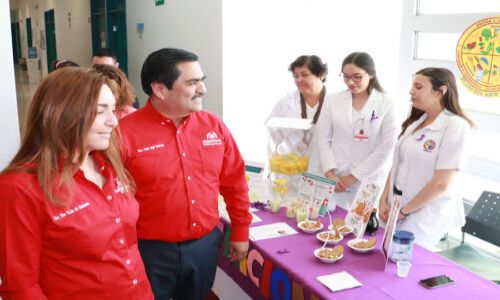 Pedro Ángel Contreras López, director general del Instituto, acompañado de su esposa Elva Garza de Contreras, titular del Voluntariado, visitó la feria que contó con el apoyo de personal de enfermería, médico, administrativo y pasantes de carreras de la salud que realizan su servicio social en el CIAS Sur.