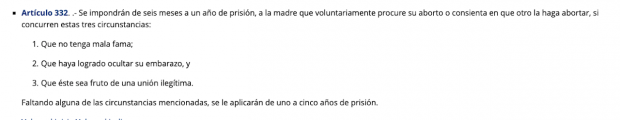 Actualmente dicho artículo disminuye la pena en prisión si la mujer “no tiene mala fama”, “haya logrado ocultar su embarazo” o “sea fruto de una relación ilegítima”, ninguna causal habla sobre la salud de las mujeres o el derecho a decidir de ellas sobre el número de hijos.