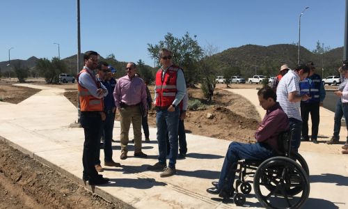 En el recorrido, se revisó el avance de la obra en general y por rubros, y se pudo constatar que la pavimentación de los más de 2 km lineales de vialidades internas conectoras de las diferentes áreas del parque, así como la obra de infraestructura hidráulica al interior del mismo y las banquetas se encuentran al 100 porciento, es decir, están terminadas.