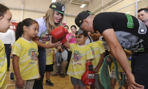 Acompañada por Juan Francisco “Gallo” Estrada, campeón supermosca del Consejo Mundial de Boxeo (CMB) e invitado especial; Karina Zárate Félix, directora general del DIF Sonora y Genaro Enríquez Rascón, director general de la Comisión del Deporte del Estado de Sonora (Codeson), la mandataria estatal observó las distintas actividades que se desarrollan en el Pabellón Pelota y la alberca “Héroes de Caborca”, en la Unidad Deportiva del Noroeste, y convivió con los pequeños y entrenadores de la Ola Roja que forman parte del Campamento de Verano, el cual también integra a niñas, niños y adolescentes con discapacidad.