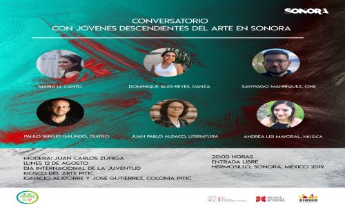 Hermosillo, Sonora; agosto 12 de 2019.- Jóvenes sonorenses destacados en el teatro, la música, la danza, el cine y la literatura, descendientes de grandes representantes del arte en la entidad, se reunirán este lunes 12, en un coloquio organizado por el Instituto Sonorense de Cultura (ISC),