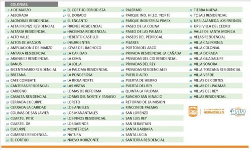 Ampliación Ladrilleras Ampliación Primero Hermosillo Buenos Aires Camino Real Camino Real Norte Carmen Serdán Cerro Colorado Condominio San Pablo Conquistadores División del Norte Dunas Etapas El Mirador (al oriente de calle Cabo San Antonio). El Triunfo Floresta Secciones Fonhapo Francisco Eusebio Kino Héctor Francisco Romero Etapa II Ladrilleras Misión Misión del Arco Misioneros
