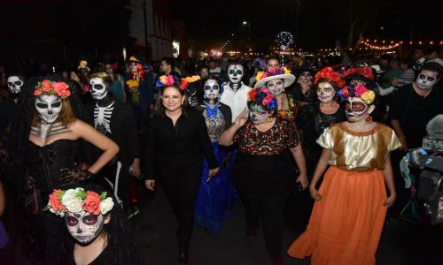 La munícipe se incorporó a un colorido contingente de marchantes, ataviados y maquillados con ingeniosos diseños alusivos a la mexicana tradición del Día de Muertos, que partió desde la plaza Emiliana de Zubeldía con destino al bulevar Hidalgo, precedido por una carroza fúnebre y los músicos integrantes del Ensamble de Pável.