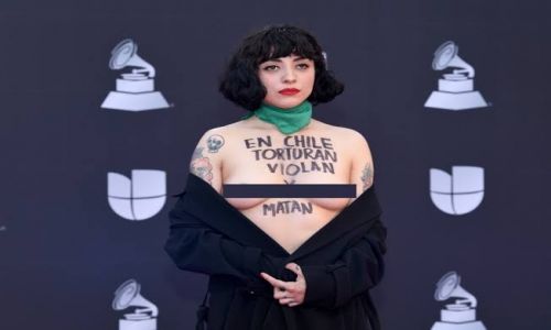 Durante la alfombra roja del Grammy Latino la cantautora chilena mostró su busto desnudo, sobre el que escribió la frase “En Chile torturan, violan y matan”