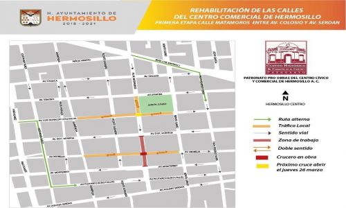 Hermosillo, Sonora, 23 de marzo de 2020.- La Coordinación de Infraestructura, Desarrollo Urbano y Ecología (CIDUE), en continuación con la rehabilitación con concreto hidráulico de la calle Matamoros en el Centro de la ciudad, cerrará el cruce con la Morelia a primera hora de este martes.